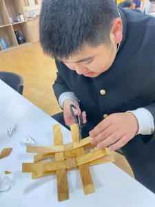 霧吹きを使って、しっかりと素材を濡らして組んでいかないと木が割れてしまうので